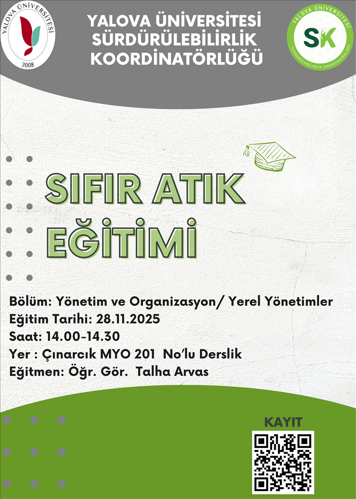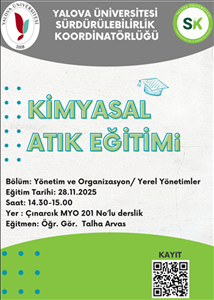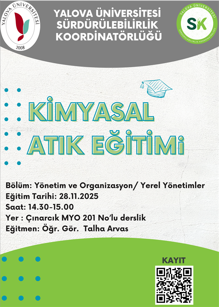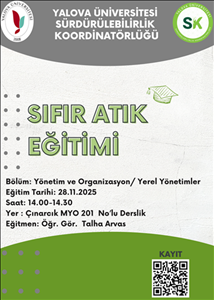 Yalova Üniversitesi Sürdürülebilirlik Koordinatörlüğü tarafından 2025 yılı içerisinde üniversite genelinde özellikle sıfır atık ve kimyasal atıklar ile alakalı tüm öğrencilere yönelik planlanan eğitimler Yönetim ve Organizasyon Bölümü / Yerel Yönetimler Programı ikinci sınıf öğrencilerine yönelik olarak düzenlendi. Gelecek nesillere daha yaşanılabilir bir Dünya bırakmak için özellikle sıfır atık yönetimi konusunda sunumlar yapıldı. Öğretim Görevlisi Talha Arvas tarafından verilen eğitimde, okulumuzda bulunan atık kutularına doğru maddelerin atılması, buralarında kesinlikle çöp kutusu gibi değerlendirilmemesi ve özellikle sağlığa zararlı olan kimyasal maddelerden uzak durulması konusunda öğrencilerde farkındalık oluşması üzerinde duruldu.